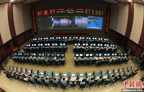 资料图:2011年11月14日晚,天宫一号与神舟八号实现第二次交会对接。图为神舟八号与天宫一号对接中的北京航天飞控中心。中新社发 秦宪安 摄