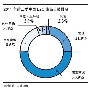 如无意外,2011年国内B2C电子商务销售排名应为:淘宝商城、京东商城、苏宁易购、卓越-亚马逊、一号店、当当、凡客。排名可以看出两个特点,除了凡客之外,几乎都是清一色以渠道定位的公司;除苏宁易购外,均为没有传统零售经验依靠的“纯电商公司”。