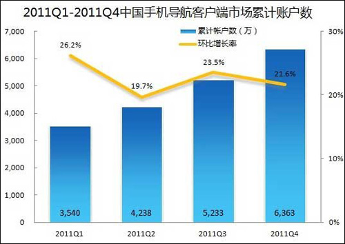 截止2011年12月底,我国手机导航客户端累计6363万账户