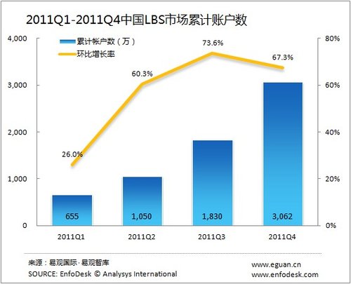 根据EnfoDesk易观智库最新发布的数据显示,截止2011年12月底,中国移动位置交友应用(LBS)市场累计账户规模达到3062万户,环比增长率回落至67.3%。