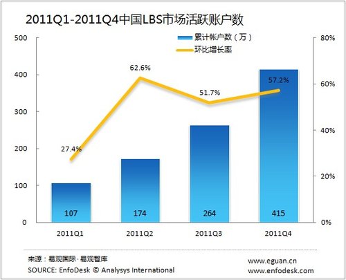 截止2011年12月底,中国移动位置交友应用(LBS)市场活跃账户规模达到415万,环比增长率提升至57.2%。