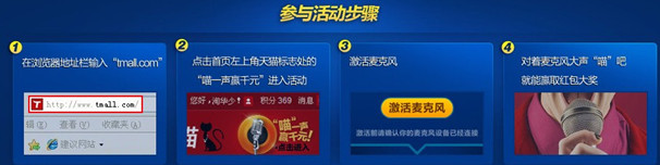 即日起至2月26日,只要天猫用户在浏览器地址栏输入tmall.com登陆天猫首页,并点击页面左上角天猫标志处“喵一声赢千元”,就能进入活动页面。激活电脑麦克风后,对着“喵”一声,页面上即可跳出一只动态的猫咪,同时会员将有一定几率获得5元或1000元的支付宝红包,每天10000个名额。需要提醒大家注意的是,由于抽奖送出的是支付宝红包,因此需要参与者捆绑有效的支付宝账号。