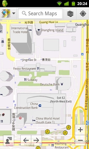 Google Maps for iOS(下图)、桌面电脑的Google Maps相比Google Maps for Android(上图)显然在3D建筑的显示上差出老鼻子了,因为Google Maps for Android已经具备了矢量数据的显示能力,所以它可以做到更平滑的显示(在视图刚刚出现时会有明显的建筑物长高动画,建筑物越高越明显,在移动视图的过程还可感觉到建筑物跟着你的视角在移动),且请求的数据量也更小。而Google Maps for iOS由于多年不让更新,所以显示的还是位图数据,其3D感显然不太明显。