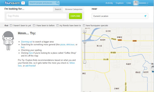 Explore功能通过Foursquare自己构建的社交图谱,向用户推荐朋友曾经去过或者喜欢的地方,同时也提供来自Foursquare网络的推荐窍门和评论。Explore最初只是围绕用户所处位置进行推荐,但在得到最新升级之后,它可以让用户通过移动屏幕上的地图或者输入确切位置信息,找到世界各地的推荐地点。
