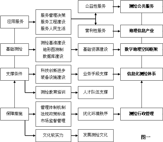 测绘管理是测绘工作的重要内容,主要包括测绘管理体制建设、测绘法规政策制定、测绘市场监督管理等。此外,测绘事业发展中还包括测绘人才队伍建设和测绘文化建设等,在此不一一赘述。测绘事业的总体架构及其形成可以用图一表示。