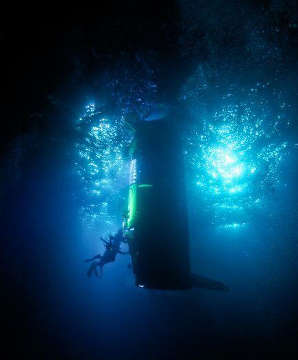 2月23日,巴布亚新几内亚海域,潜水员们正在帮助深海挑战者号做下潜测试前的最后准备工作。这一次它将下潜超过1000米,全程持续6个小时。