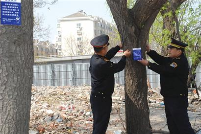 记者了解到,自今年2月份开始,四方区城管执法局就开始组织执法人员对辖区老企业搬迁原址、拆迁工地、待开工项目地块中的树木情况进行了普查,并系挂了温馨提示牌。四方区现有7处待建地块,其中兴隆路、阀门厂、金马箱包厂等5处工地的412株树法桐、杨树、榆树、松柏、柳树、水杉、樱花、芙蓉等全部登记造册,并挂上了“温馨提示牌”。今天上午,四方城管开始集中对树木进行编号,统一发放“身份证”。在现场,执法人员还比照卫星定位地图用GPS确认了每一棵树木的位置,“最大误差只有1厘米左右。 ”