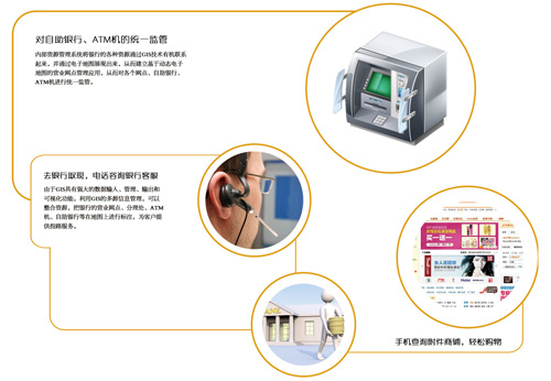 面临日益竞争激烈的金融业,为了更好的进行内部管理,维持好并寻找更多的优质客户,银行越来越多将GIS应用于内部资源管理和高端客户分析。内部资源管理系统将银行的各种资源通过GIS技术有机联系起来,并通过电子地图展现出来,从而建立基于动态电子地图的营业网点管理应用,从而对各个网点、自助银行、ATM机进行统一监管。针对自助银行的监控系统,会详细显示自助银行中每台设备的运行状态,并根据客户定义的规则进行事件报警,通过列表数据和图形数据结合显示的方法,使管理人员可以基于GIS,通过多种途径和方法进行对自助银行的监控。并能随时将页面显示的信息保存为图片,以备事后调用。同时,银行还通过网点新增、网点建设跟踪、网点升格、网点升迁、网点撤销、网点资产核查、网点测距等功能,对网点进行全方面管理。高端客户分析系统能够对银行大客户的分布情况、大客户的地域分布特点进行分析,从而方便银行维护并寻找优质客户。