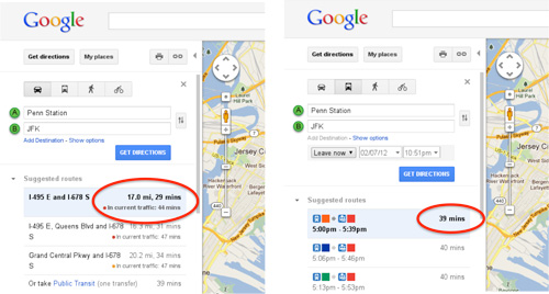 Google表示实时预估数据主要依赖于“当前及历史交通数据”。与此前一直所使用的理想或平均时间相比,根据当前情况预估到达目的地所需时间将更有价值。因为上下班高峰期和其它时间的路况有很大不同,能让用户结合当前实际路况选择最优路线。