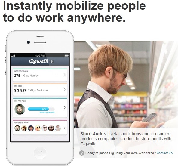 Gigwalk是这样一款移动应用:各大公司可以通过这款应用,根据用户所在的地理位置向他们分配一些简单的活儿。用户只要按要求完成工作,就能获得相应的报酬。现在,Gigwalk又推出了一系列新的工具,方便公司更好地通过手机管理和分配他们的工作。