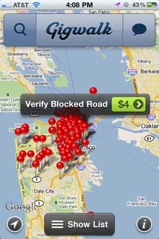 Gigwalk是在去年发布的。用户只需下载应用,输入他们的Paypal信息,就可以“认领”各种轻便的活儿了。这些工作干起来可能也就只花几分钟,用户却能为此收益几美元。举个例子:TomTom公司就利用的Gigwalk上面广阔的移动劳力大军,让处于某些位置的用户去拍照并核实他们的导航点,比如单向的街道等等。对这些用户来说,他们只需拍张照,然后用电子邮件传送照片,合格之后就能得到几美元。