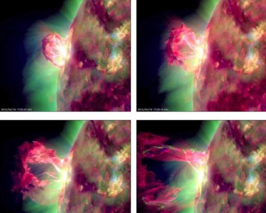 北京时间4月19日消息,据国外媒体报道,16日下午大约5点45分,美国宇航局的太阳动力学观测卫星拍到壮观的太阳耀斑。当时,耀斑从太阳东北部喷涌而出,将美丽的弧形超热等离子喷流射向太空。这是最近几年出现的最美丽同时最壮观的太阳风暴之一。