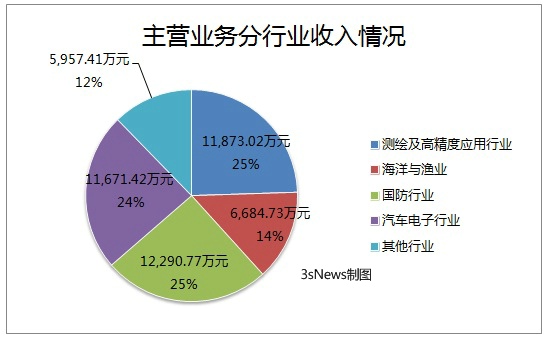 报告期内,公司主营业务的测绘及高精度应用行业营业收入11,873.02万元,比上年同期下降9.02%,毛利率33.76%;海洋与渔业的营业收入6,684.73万元,比上年增长23.26%,毛利率49.31%;国防行业的营业收入12,290.77万元,比上年增长33.98%,毛利率40.69%;汽车电子行业实现营业收入11,671.42万元,比上年同期增长663%,毛利率18.03%;其他行业收入为5,957.41万元,比去年同期增长57.93%,毛利率48.41%。