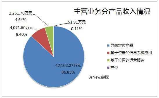 根据产品情况统计的营业收入分别是:导航定位产品实现营业收入42,102.07万元、基于位置的信息系统应用为4,071.60万元、基于位置的运营服务为2,251.70万元、其他产品收入为51.91万元。