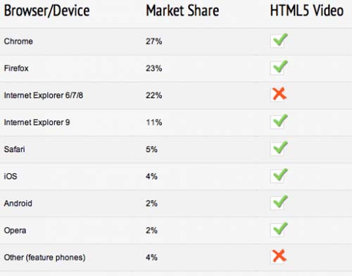 在桌面端赶超Flash格式,HTML5 还面临不少的困难,但在iOS和Android平台上,HTML5业已成为最新的标准。LongTail指出,IE 6/7/8不会支持HTML5,但Google Chrome, Mozilla Firefox和最新版的微软IE都在增加和改进对HTML5 的支持,不支持HTML5的浏览器份额继续下降。