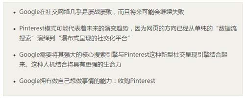 从以上可以看出,Google应该对Pinterest做了非常仔细的研究,因此如果Google哪天宣布收购Pinterest,我们将不会感到意外。事实上,我们之前曾对Google收购Pinterest做过非常详细的探讨,在《为什么Google应该立即收购Pinterest》一文中,我们给出了以下几个理由: