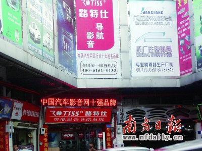 以广州地区为例,汽车导航产品的销售主要集中在岗顶电脑城和永福路汽配城周边,在岗顶电脑城的百脑汇和颐高数码广场,导航产品卖家多分布在数码配件楼层。不大的店面位置中堆满了耳机、鼠标、存储卡等数码配件。导航仪都不作为主打产品,并没有形成一定规模。而在永福路汽配广场,专门做导航产品的商家只有数家,大多数的导航产品是作为汽车配件进行搭售,在偌大一条汽配街,想找一幅大点儿的导航仪广告牌都很难。