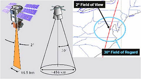 快鸟(Quickbird)卫星的拍摄范围示意图,0.6米分辨率高精度拍摄时视野宽度只有16.5千米(GoogleEarth里的城市高清晰图片就是这样获取的),粗精度、广范围拍摄时视野可达456千米,但这时的分辨率只有30米(GoogleEarth里的自然地域粗精度图片就是这样获取的)。