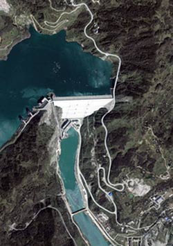 由于中国国土资源部门和DigitalGlobe有长期的紧密合作关系,在四川汶川大地震后,DigitalGlobe公司就及时免费提供了快鸟(Quickbird)卫星的震区照片,以供救灾所用。这是拍摄到的紫坪铺水坝。