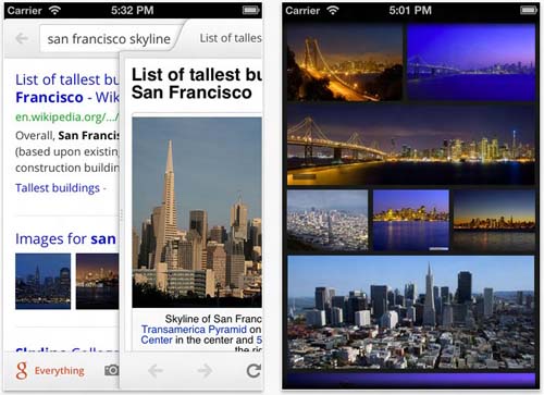 今天,Google发布了iOS版Google Search 2.0版本,和上一版相比有了很大的变化。其中更快速的搜索、全屏图片搜索显示和一键接入应用中心是新版本的三大特色。