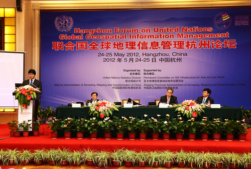 5月24至25日,由联合国统计司和国家测绘地理信息局共同主办、浙江省人民政府和亚太地理信息常设委员会协办的联合国全球地理信息管理杭州论坛在浙江杭州举办。国土资源部副部长、党组副书记,国家土地副总督察,国家测绘地理信息局局长、党组书记徐德明,联合国统计司司长张保罗,浙江省副省长王建满出席论坛开幕式。