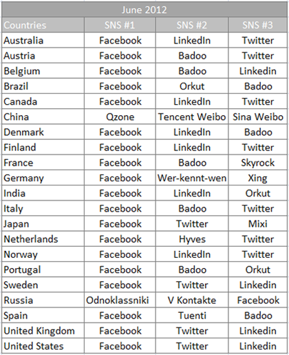 Facebook 是霸主,这自不待言,那被它超越的或正在奋力追赶它的老二老三又是谁呢?看看下面这个表格就明白了: