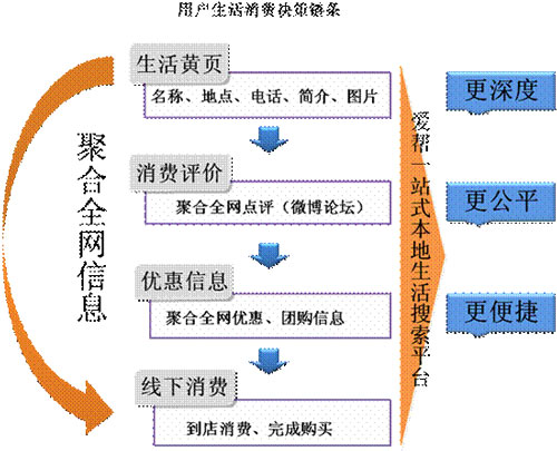 附近搜索首先聚合全网商户的深度信息,包括商户名称、地址、电话、图片、地图等;其次聚合来自点评网站、微博等的全网消费评价,让用户接触到更客观全面的消费评价,辅助其进行消费决策;第三,爱帮还聚合互联网上所有商家的优惠及团购信息,集中展示包括各团购网站或优惠网站上关于某个商户的优惠或团购信息。附近搜索提供的服务,从深度的商户信息,到客观的消费评价,再到便捷的优惠信息,全方位影响用户的消费决策,并最终促成到店消费。