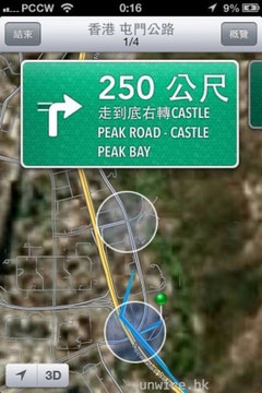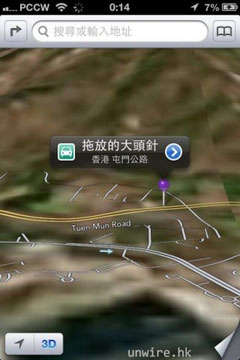 这次出现在iOS 6中“地图”与过去的图标有着明显的差异,但定位的速度较快,通常两到三秒便可完成。不过,尽管理论上说点按“3D”按键,便可以浏览3D地图,不过至少目前香港地图并不支持这项功能,甚至2D与3D地图的差异,也只是后者的视点比较斜,而非2D的天空直向鸟瞰视点。尽管如此,新版地图加入的“Turn-by-Turn Basis”导航功能却十分好用,例如要知道怎样从现在的位置前往目的地,只要在目的地加入大头针即可,并且即便是是步行模式,也同样可以通过该功能进行导航,这样比较适合初到的外地的用户使用。