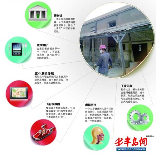 与餐厅相邻的是整个产业园最核心的部分——展示区。这里将会展示众多虚拟技术。王晓介绍说,像数字地球、工业仿真、航空航天、虚拟医疗等技术,能让人提前体验未来世界的样子。