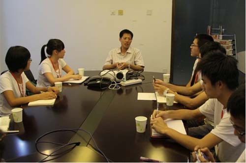 简单的参观过后,实践队成员在井冈山会议室与刘总进行了深入的沟通与交流。期间,队员们积极提问,就如何学好大学专业课、如何完善自己符合社会需要、如何做好正确的职业规划以及行业发展等相关内容进行了互动交流。刘玉璋总裁结合自身在大学里的经历以及自己的创业史对队员们的问题做出了一一解答。在访谈最后,刘玉璋总裁还送给大家一句寄语:“志在高远,脚踏实地”。