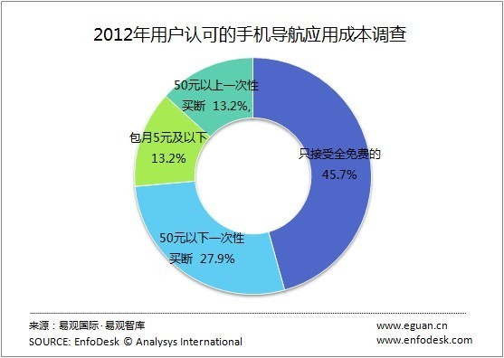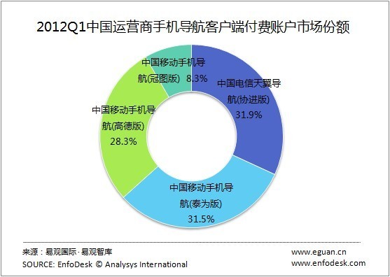 易观国际:根据EnfoDesk易观智库产业数据库《2012年第1季度中国运营商位置服务市场监测报告》显示,1季度,中国电信天翼导航(协进版)、中国移动手机导航(泰为版)、中国移动手机导航(高德版)及中国移动手机导航(冠图版)分别以31.9%、31.5%、28.3%及8.3%的份额分享中国运营商手机导航付费市场。