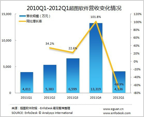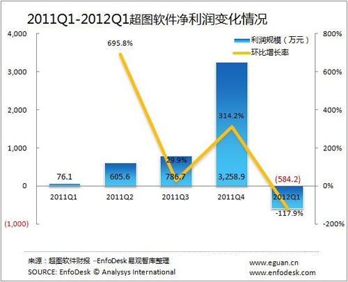 易观国际:超图软件日前发布了2012年第一季度(截至3月31日)财务报告。财报显示,2012年第一季度,公司实现营业收入为4,135.79万元,较去年同期增长3.12%;报告期内,公司实现营业利润-669.12万元,较去年同期减少778.58%;实现利润总额-585.34万元,较去年同期减少675.99%;实现归属于上市公司股东的净利润为-620.71万元,较去年同期减少1283.48%。