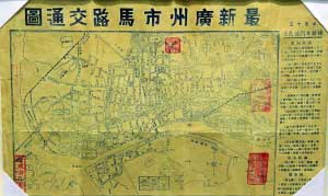 1918年1月17日晚,广州城南永汉街发生火灾,附近数条街道64间房屋被焚毁。广州当局乘机拆除永汉门和受灾邻近地段的一些房屋,修成永汉马路。这是广州市第一条马路。同年10月,广州市政公所成立,整个市区行政区域统一规划,为了发展公共交通,拓展市区,市政公所以拆除城墙为首要任务。此后广州市政建设取得了不少成就,广州旧城区的许多重要马路都是在这一时期规划和命名的。这段城墙拆除、马路修建、老城区全面改造的过程,也从民国时代的这些老地图中得到印证。到了民国三十五年(1946)绘制的《最新广州市马路交通图》里,市内主要街道和马路已见雏形,还附有长途汽车交通线路表。