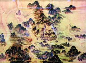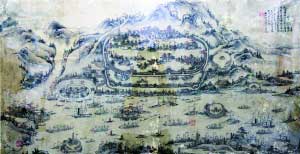 幸运的是,反映广州城的第三次扩展时期明代的地图,在这次展览中可以看到。明城包括老城和新城。老城由宋、元三城合并扩建而成,北跨观音山( 今越秀山) 上,抵今越秀公园内的镇海楼及其旁的镇海路、盘福路和广州市第一人民医院东、西门之间的干道, 南临今文明路、大南路和大德路, 东至今越秀北路、越秀中路, 西界今人民北路南段和人民中路。老城周长二十一里, 有城门8座:东有正东门、西有正西门,南有定海门(也称小南门)、文明门、正南门, 北有大北门、小北门今天许多街道的名字,就来自此时。由于老城以南的新淤地, 商贾云集,而无城垣防卫,明嘉靖四十五年(1566)又在宋雁翅城基础上建成新城。选自明《永乐大典》卷一的《广州府境之图》,是目前所能看到最早反映广州城布局之一的地图,从这张图上可以看到明代广州城北半部为行政中心,大量官衙集中于惠爱街(今中山四、五、六路)以北,沿江一带为繁盛的商业区。到了清代的地图中,就可以看到西关从明代的农田逐渐形成十八甫商业区,位于珠江南岸的河南地区在清代也得到进一步的开发。从这些变化中,可以清晰地看到整个城市经济文化中心的南移。
