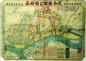 最新测绘广州市面马路区域全图光和眼镜公司制,该图反映了20世纪初广州拆城墙建马路的状况,图中详细标明各街道和马路,其中"旧日马路"、"现筑一百英尺马路"、"现筑八十英尺马路"涂以黄色,"预辟二期马路"涂以红色,并且在图右注明由市政公所规定开辟二期马路各线路的尺寸。标有"第一公园"(今中央公园)、"旧总统府"(今中山纪念堂附近)、"省议会"(今广东革命历史博物馆)等,并绘有旧城墙。因为这张地图是光和眼镜公司的赠品,所以还特别标明了公司下属各店铺的所在位置,并附有该公司的广告语多先进的营销理念啊。