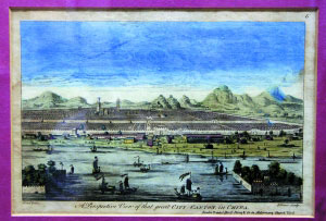 广州城市全景图43.5×34.5cm英国伦敦Delin绘制,铜版画手工套色,梁基永先生藏品。此图为广州未向外国人开放之前所绘制。由于道光初年广州城不对外国人开放,故此外国人只能在西关和河南活动,对宏大的广州城感到非常好奇。此图在河南船只的桅杆上远眺广州城所绘制,从图上可以看到,广州城的布局非常壮大,所以英文称为“大城市”(great city),从图上看,城外河边还是一片荒地,城中可见光塔和六榕塔等地标建筑。此种图供外国人了解广州这个唯一开放的口岸所用,绘制时间应该不晚于道光初年。