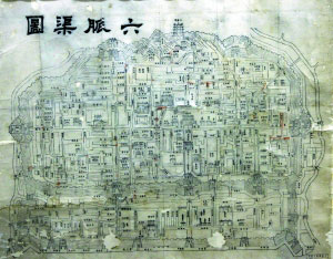 此次展览中有一张绘于清同治九年(1870年)的《六脉渠图》,是省立中山图书馆的藏品。六脉渠是指古代广州古城内六条排水大渠,兼有排水、航行之便利。广东省政协常委、广东省社科院研究员陈忠烈感慨地说,六脉渠最早形成于宋代,明、清均有重疏、修治,在明代,就已经用竹管引白云山水到广州城中了:“广州人明代就享受自来水,这真的不得了。他的水涌都是通的,六脉通海。我们现在都是断头涌,你分段治理,效果怎么样呢?看看这些古地图,可以反思我们的城市发展。”