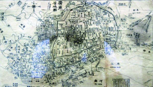 倪俊明告诉我,广州城建于秦代,当时称作任嚣城,自东汉步鹭重建后至唐初均无扩城的记载。由于当时城垣的功能以保护官衙为主,商业多在城外,故城垣范围均很狭小。北宋时期在今芳草街、文明路一带修建了东城,今人民路、大德路一带修建了西城。南宋时期,随着广州外贸日益发展,城南沿江岸一带逐步形成略具规模的商业中心,因而有必要建城加以保护,因而修雁翅城直抵珠江边。元初曾将广州东城、西城拆毁,后行修复。然而,据青年收藏家、此次展览的展品提供人之一梁基永介绍,由于当时地图属于国家机密,拥有舆图就相当于拥有四海,所以地图一般由官方而非民间测绘,也没有大量绘制供普通人使用,因此数量很少。再加上年代久远,我们今天很难看到。