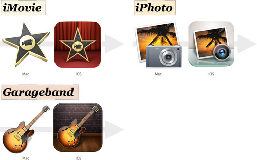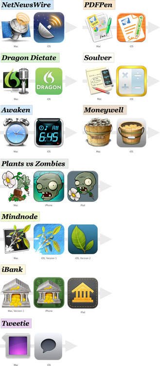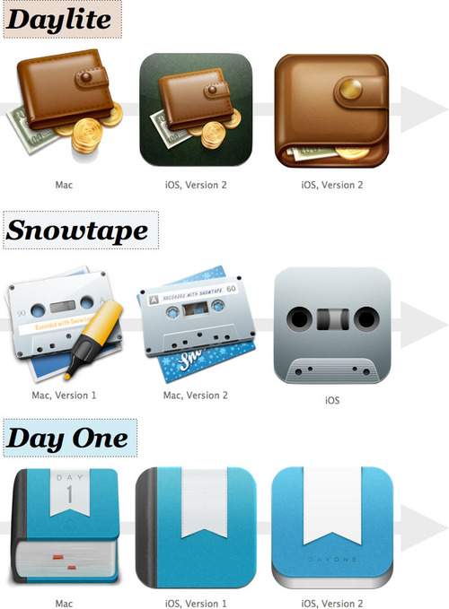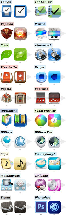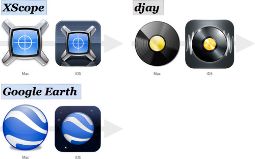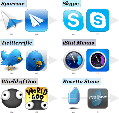 下面的这些应用,你很容易区分他们是什么平台上的,经过几次改版之后,他们越来越有移动应用的味道了。从Mac到iOS,他们保留了许多设计元素,包括重要的符号或配色方案。但是在iOS的图标设计时,又加入了许多新的设计元素。比如让图标稍稍倾斜,放大局部的特征等等。这些都是优秀的移动应用图标设计思想。