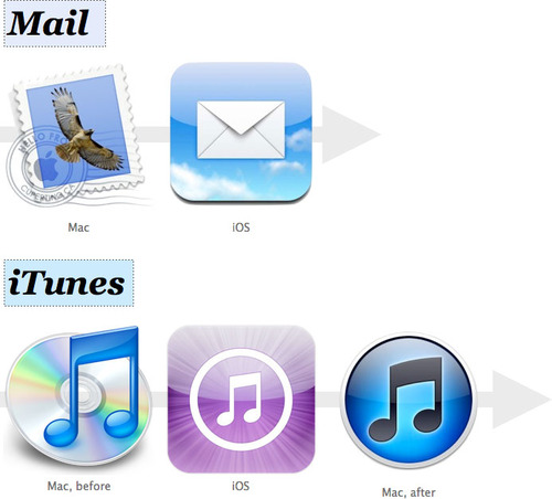 下面苹果的这几个图标,虽然能看出来美编认真干活了,但是我仍然持保留观点。苹果在iWork中的图标起码还保留了相同应用的设计风格。然而mail和itunes这两个应用,我觉得设计人员是应该反思的。他们看上去就像是不同的应用的。