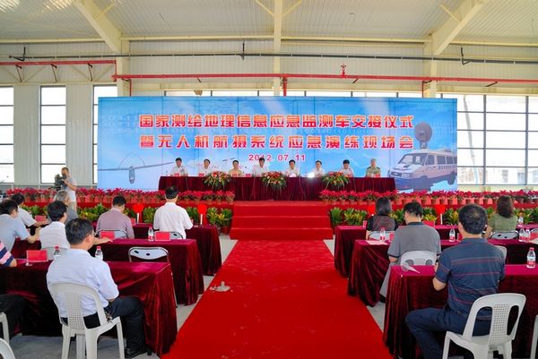 在交接仪式现场,国家地理信息应急监测车进行了应急演练。无人机在不同的高度平稳飞行,快速获取不同比例尺的数据,博得到会嘉宾阵阵掌声。
