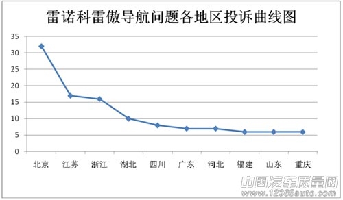 而从地区上看,北京投诉32宗,江苏投诉17宗,浙江投诉16宗,湖北投诉10宗,四川投诉8宗,广东投诉7宗,河北投诉7宗,福建投诉6宗,山东投诉6宗,重庆投诉6宗等等。如果说导航不准、卫星信号弱发生在一些偏远山区或2、3线城市这都无可厚非,可能是由于地图采集及地域限制问题导致。但从地区分布上看,北京、江苏、浙江这些1线城市投诉名列前三甲,从这一点可以说明雷诺科雷傲的TomTom导航确实存在一定缺陷,地图版本陈旧无法实现精确导航。