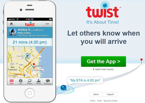 许多人都曾有这样的经历:去赴一个重要约会,原本计划晚上7点钟到,却被缓缓蠕动的车流堵在了路上。无奈之下打电话或发短信,抱歉地告诉对方你会晚10分钟,结果交通状况始终不见好转,等你历尽千辛万苦终于赶到时,一看表已经7点40了。不但你会感到尴尬,等你的人也会觉得你不够守时。美国创业公司Twist开发了一款手机应用,希望化解这一难题。