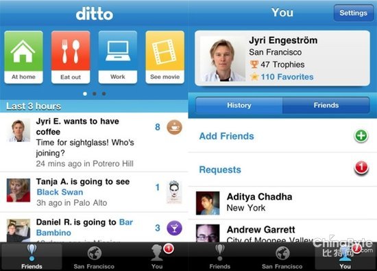 Ditto曾被认为是地理位置服务新风向的开始,因为在Foursquare还主打签到时,Ditto希望为用户提供实时推荐,在推荐的基础上帮用户规划聚会。比如用户发布想要做的事情,朋友可以跟随,也可以向对方推荐内容。产品融合了签到、推荐和聊天的功能。
