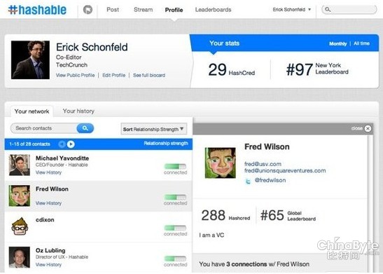 Hashable,试图用自己的产品来代替名片,帮助人们相互引荐和交流信息。被称为“管理社交资本的Mint.com”,也被认为和LinkedIn有“轻量级”的较量,融资400万美元。创建该产品之前,Hashable创始人Michael Yavonditte曾在2007年将自己的公司Quigo以3.4亿美元卖给了AOL。