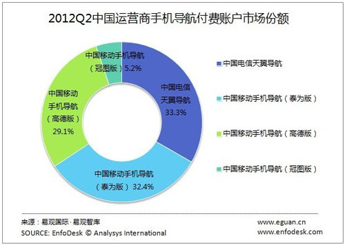 根据EnfoDesk易观智库产业数据库《2012年第2季度中国运营商位置服务市场监测报告》显示,2季度,中国电信天翼导航、中国移动手机导航(泰为版)、中国移动手机导航(高德版)及中国移动手机导航(冠图版)分别以33.3%、32.4%、29.1%和5.2%的比例分享中国运营商手机导航(易观百科:手机导航)付费账户市场份额,前三明的份额都比较接近,市场已经进入了三强争霸的新时期。