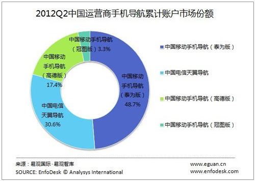 根据EnfoDesk易观智库产业数据库《2012年第2季度中国运营商位置服务市场监测报告》显示,2季度,中国移动手机导航(泰为版)、中国电信天翼导航、中国移动手机导航(高德版)及中国移动手机导航(冠图版)分别以48.7%、30.6%、17.4%和3.3%的比例分享中国运营商手机导航累计账户市场份额(包括付费账户和免费体验账户)。