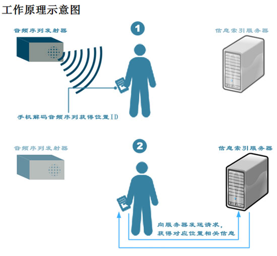 这个位置感应系统的工作原理很简单,利用一个音频序列发射器发出音频信号,用户只要持有带特别识别应用的智能移动终端经过该设备信号覆盖的区域时,就可以快速地感应到信号,从而及时获得基于此位置的服务。