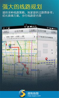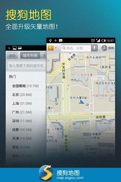搜狗地图近日正式推出安卓3.0版,全面转换为为体积更小的矢量引擎,升级后的搜狗手机地图离线包只有原来的1/10,更小更可靠,2小时就能把全中国装进你的手机里。此版中也对语音导航进行了优化,全程语音导航服务可以直接把你送到目的地门口。另外对公交换乘方案也进行了逻辑优化,不让你在主辅路间来回奔波多走冤枉路。而全国22个重点城市的实时路况功能,在这个多雨的夏季可以让你更加安全的出行,避开拥堵。