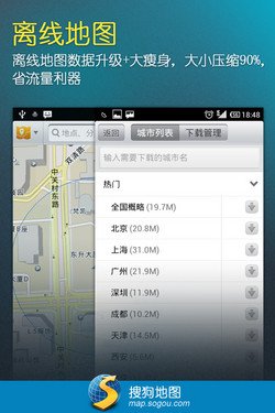搜狗手机离线地图包的最大意义在于超省流量,可支持无限放大而不需联网。同时全国数据总量保持在1GB以内,对于一些没有TF卡扩充容量的手机来说,例如魅族MX等,能够大幅减少对机身内存的占用。最近有自驾游打算的旅友,2小时就能将全国离线地图全部下载到你的手机里,还可利用过路费精确计算工具提前预估过路费支出,更加合理的安排旅行方案。